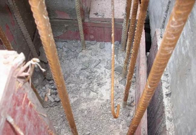 ?、贅犊變?nèi)泥、水較多未清理,或清理不干凈,使樁芯鋼筋泡在泥水中。