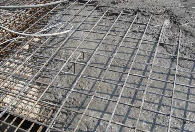 ?、萘喊屙艥仓r,被踩塌、移位、松脫的鋼筋沒有及時復(fù)位,部分板負筋鋼筋頭外露未處理。振動棒直接振鋼筋骨架使鋼筋偏位。